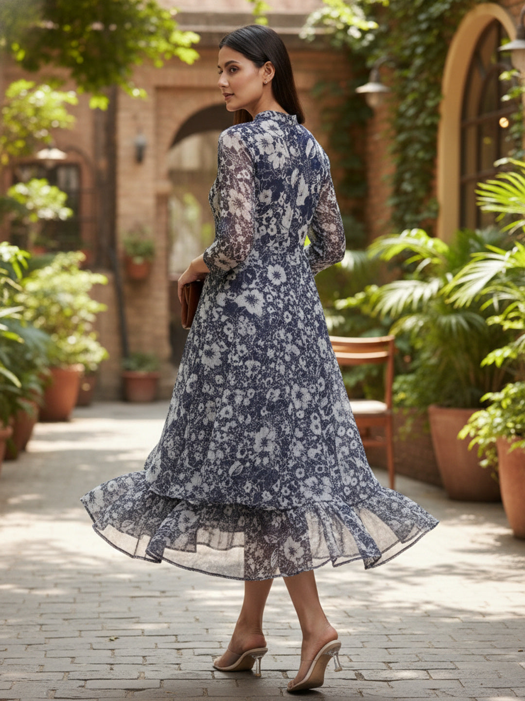 Thoughtfully tailored in lightweight chiffon, this Blue and Cream floral fit & flare midi dress features a round neck, long sleeves, gathered detailing, and a graceful flounce hem. Finished with a detachable belt and soft lining, it’s designed for breathable comfort and effortless elegance—perfect for polished daytime looks or chic evenings.