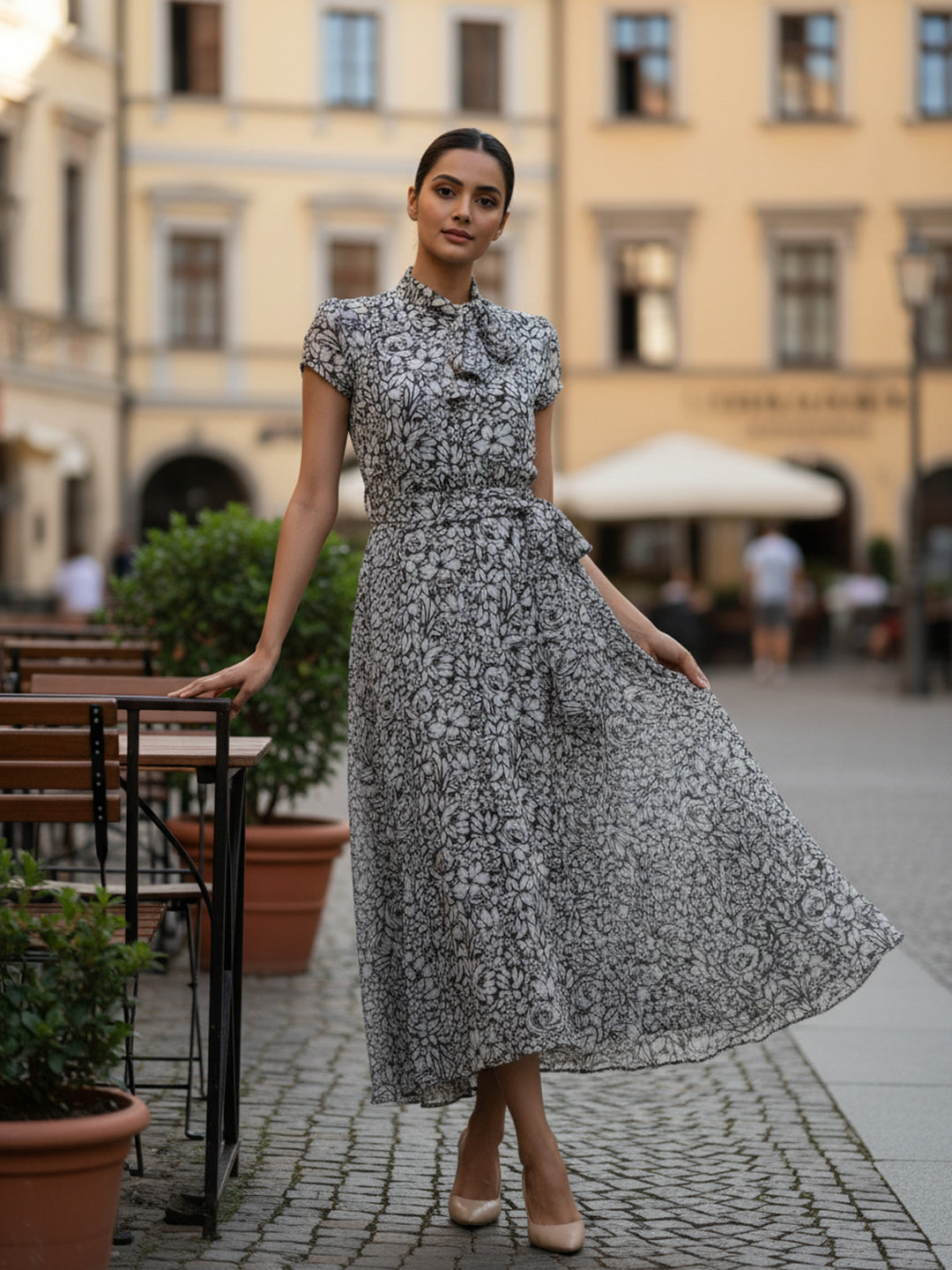 Upgrade your wardrobe with the Souchii Black & White Floral Chiffon Midi Dress, designed for effortless elegance and everyday sophistication. Made from lightweight, breathable chiffon fabric, this women’s floral print dress features a refined high neck with tie-up detail and cap sleeves for a graceful silhouette. The fit and flare midi dress design cinches at the waist and flows beautifully, making it flattering for all body types. Perfect as a workwear dress, brunch outfit, or evening casual dress, this versatile piece blends comfort with timeless style.