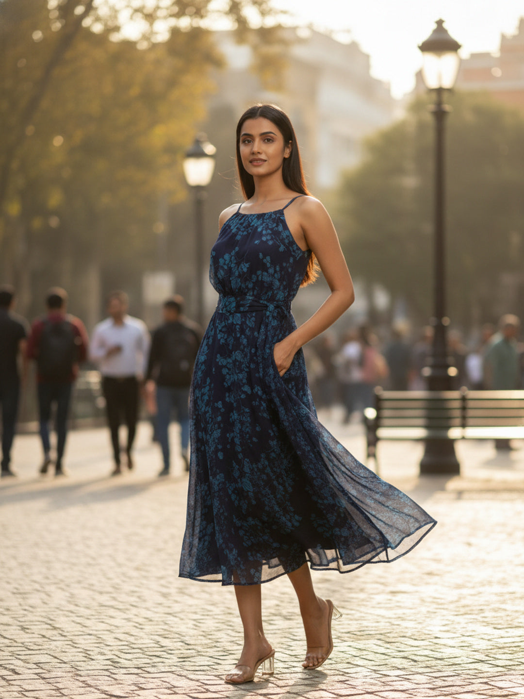 Style this dreamy blue floral chiffon dress with delicate strappy heels and minimal gold jewelry for an understated luxe look. For daytime outings, pair it with flat sandals and a soft tote. Transition seamlessly into evening by adding statement earrings and a sleek clutch. Let the dress flow freely—its elegance lies in its effortless movement.