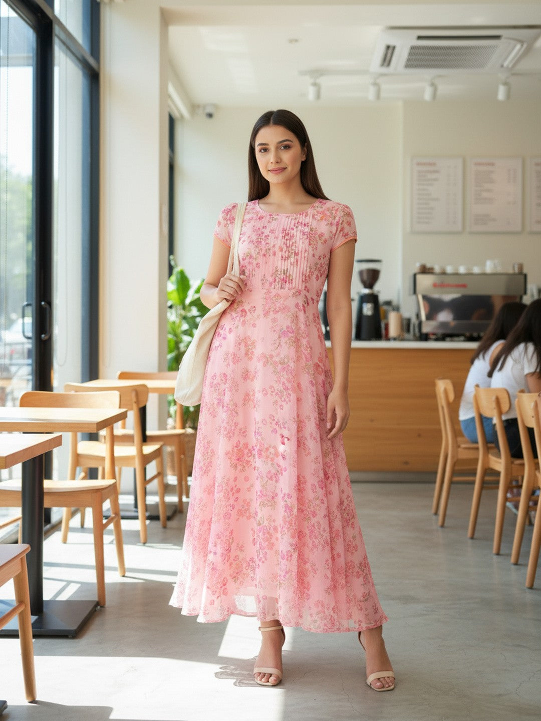 This pink floral midi dress from Souchii is a perfect blend of elegance and everyday charm. Designed in a soft, breathable fabric, it drapes beautifully while offering all-day comfort. The delicate floral print adds a romantic touch, while the fitted bodice and gently flared skirt create a flattering, feminine silhouette. Featuring a round neckline and short sleeves, this dress strikes a balance between classic and contemporary, making it ideal for brunch dates, daytime events, vacations or relaxed evening outings. The flowy hemline enhances movement, giving the dress an effortlessly graceful appeal.
